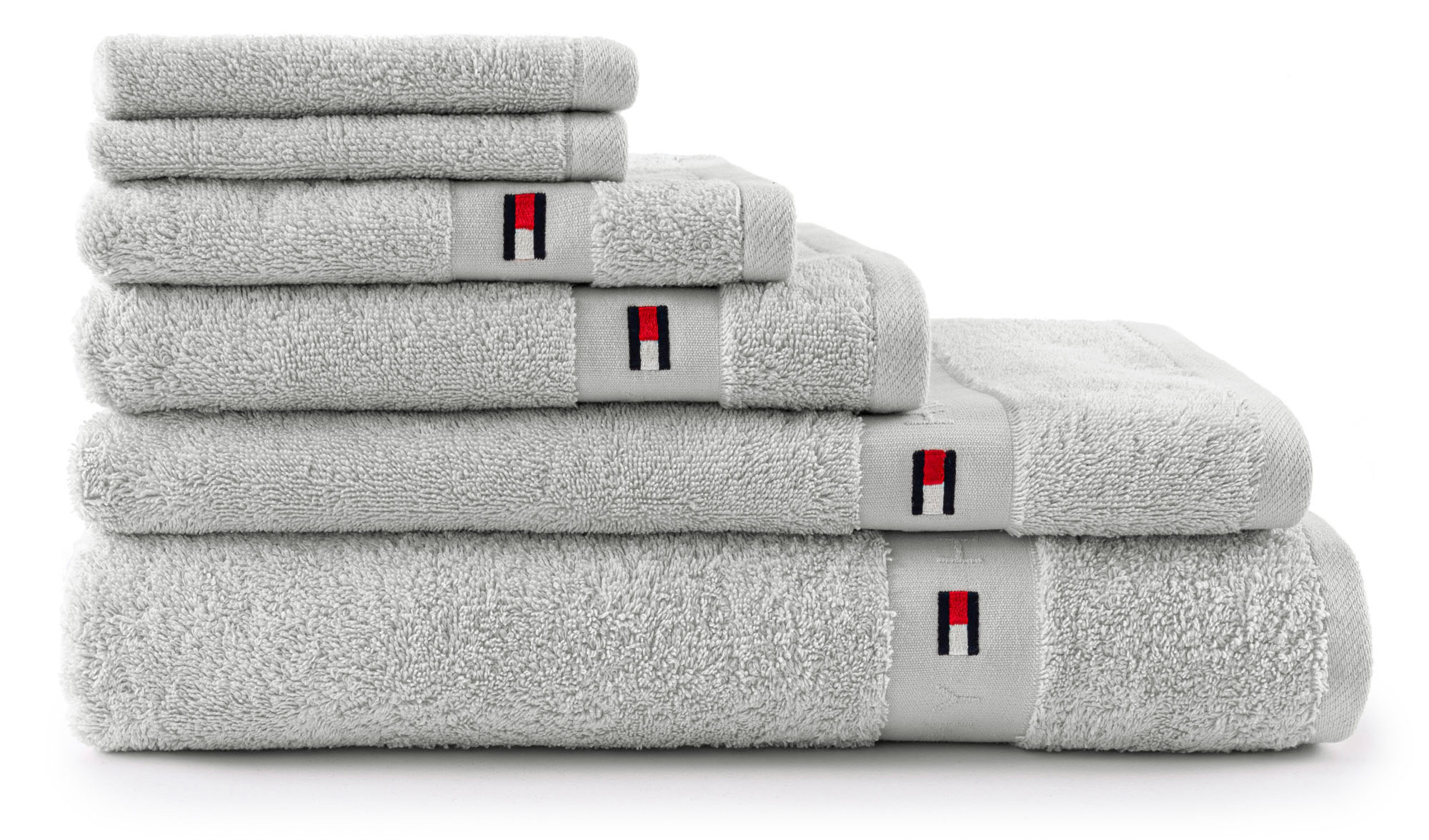 Frottiertuch der Modemarke Tommy Hilfiger aus 100% gekämmtem Baumwoll-Frottee (540 g/m²) mit Jacquard-Bordüre mit Tommy Hilfiger Flagge.